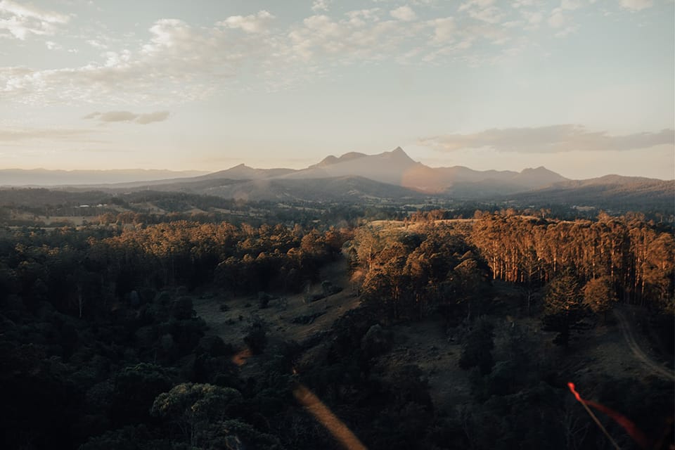 - 🏞️ Flew toward Wollumbin Mountain and its lush, green foothills